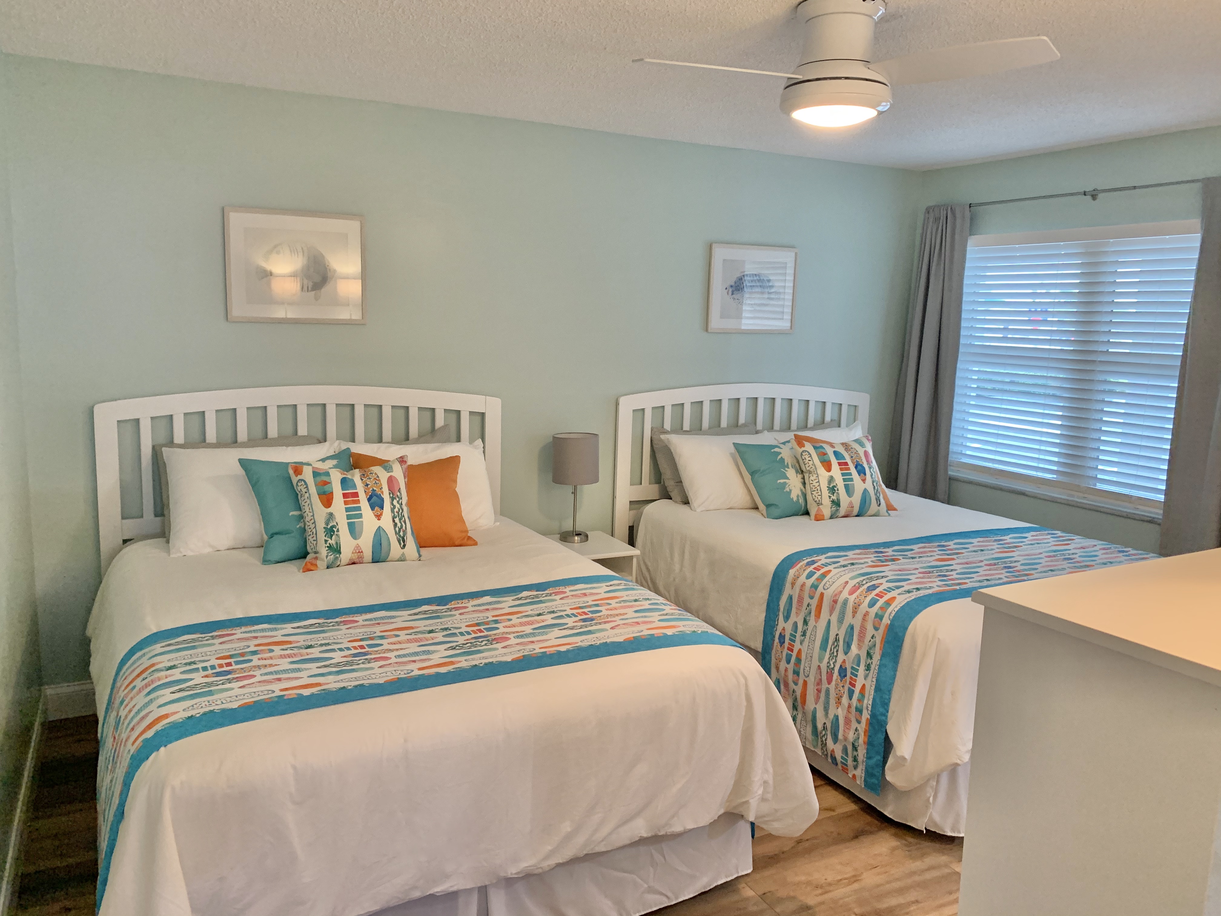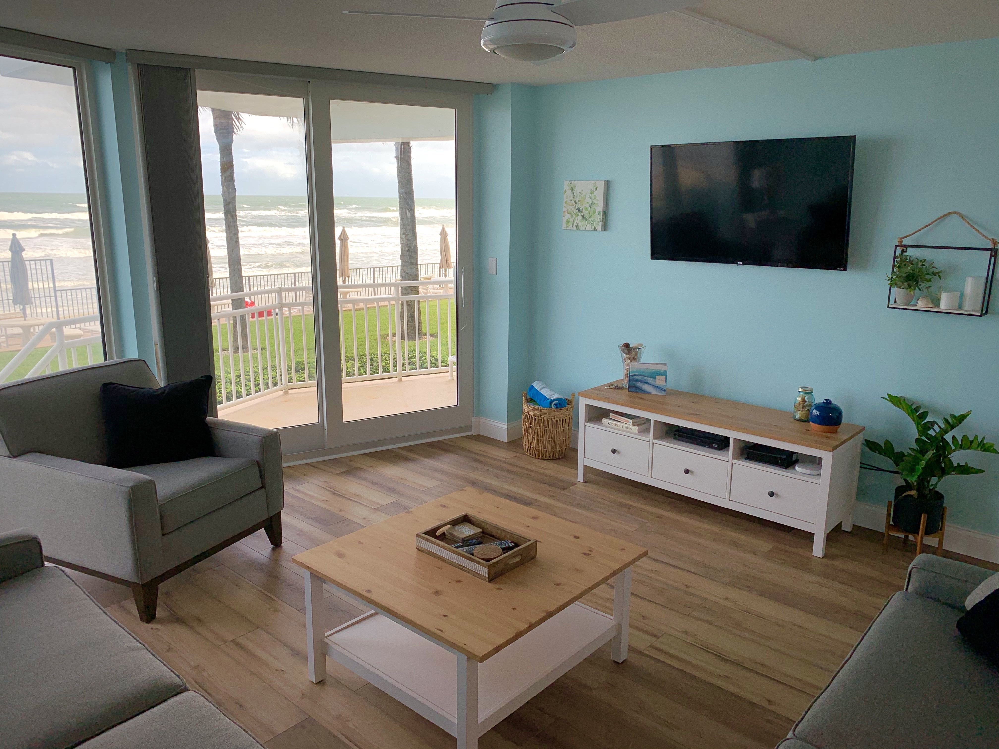 Modern, comfortable and completely renovated 2 bedroom/2 bath condo on the first floor with direct access to the white sand of Daytona Beach Shores. Conveniently located between Dunlawton Ave. and Sunglow Pier, this condo is perfect for a family vacation or extended getaway with friends. Enjoy relaxing next to the heated pool, or bring a chair down to the shoreline and let the warm waters of the Atlantic Ocean lap at your feet.